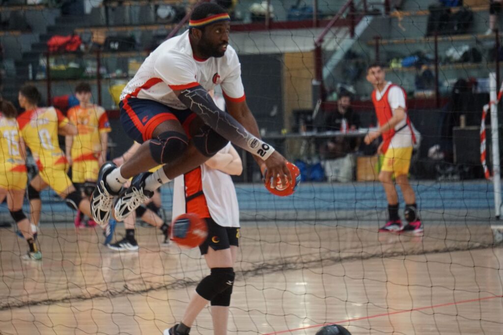 With a high, athletic jump, Steve Ndumbe dodges the clothball fired at him. The ball passes under him without hitting him. After landing, the England player immediately sprints forward with a ball that he already had in his hand (one of five others in play at the same time) to hit an opponent with it and throw him out. And a moment later he’s out of the set himself, after a dull bang of the ball on his imposing body.
