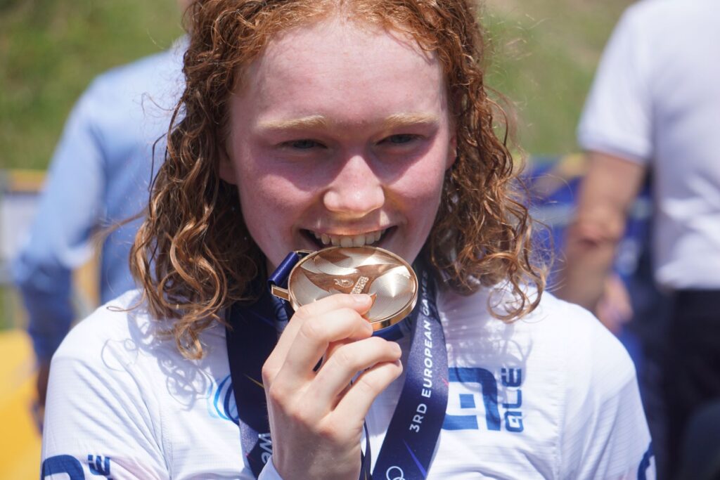 At 741 meters above sea level, Pieterse flies over beams and rocks on top of Parkowa Mountain, rams through the mud and slides over the landscaped ‘pump track’ with the small hills. There are several well-known Polish spa hotels in the valley of Krynica Zdrój, but peace is hard to find high up there. Pieterse pounds, roars and blows everyone away. From start to finish she reigns supreme at the European Games on a tricky and accentuated course.